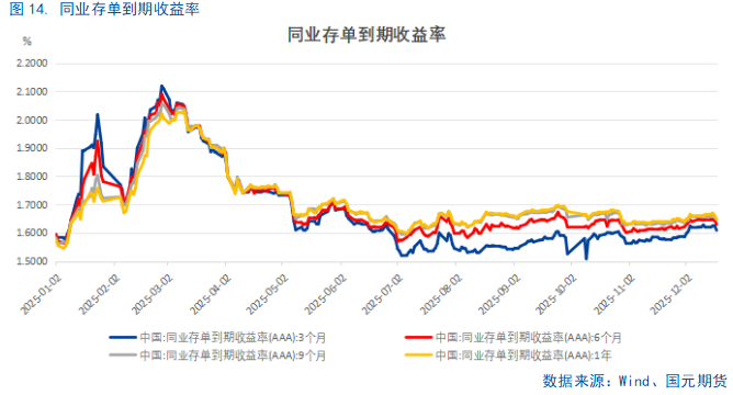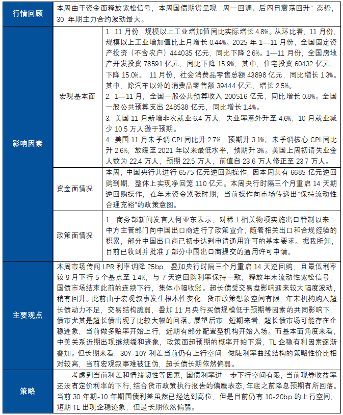 主要观点:本周市场传闻LPR利率调降25bp,叠加央行时隔三个月重启14天逆回购,且最低利率较9月下行5个基点至1.4%,与7天逆回购利率保持一致,释放年末流动性宽松信号,国债市场结束此前的连续下行,集体小幅收涨。超长债受交易盘影响迎来较大幅度波动,稍有回升。此前由于宏观叙事发生根本性变化,货币政策想象空间有限,年末机构购入超长债动力不足,交易结构脆弱,叠加11月央行买债规模低于预期等因素的共同影响下,债市尤其是超长债出现了比较大幅的回落。展望后市,短期来看,超长债市场可能存在企稳迹象,当前做多赔率开始上行,近期有部分配置型机构开始入场。而基本面角度来看,中美关系近期出现继续缓和迹象,政策面超预期的概率开始下滑,TL企稳有利因素逐渐叠加。但长期来看,30Y-10Y利差当前仍有上行空间,做陡利率曲线结构的策略性价比相对较高,当前宏观叙事难被证伪,超长债长期依然偏弱。