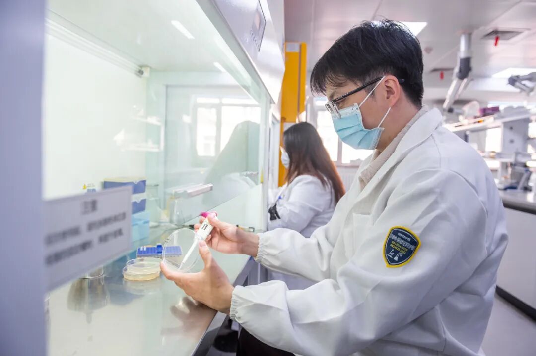 ▲象屿生化研发中心内研究员进行菌种对点传代实验