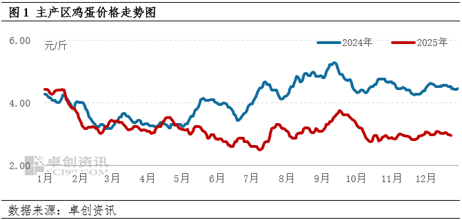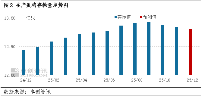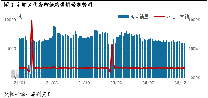存栏有下降预期,供应压力或减少。从养殖周期推算,2026年1-2月份是2025年9-10月份补栏的鸡苗,受养殖盈利不及预期影响,2025年9-10月份养殖企业补栏积极性不高,鸡苗销量呈减少趋势,因此2026年1-2月份新开产蛋鸡数量不多。从老母鸡来看,养殖企业大多计划春节前出栏老母鸡,因此1-2月份老母鸡出栏量有增加趋势。综合来看,1-2月份老母鸡出栏量或多于新开产蛋鸡数量,在产蛋鸡存栏量有下降预期,鸡蛋供应压力或减少。
