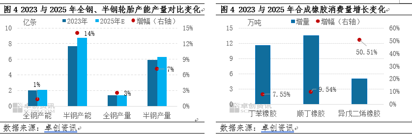 近些年,轮胎行业在新产能投放以及汽车行业稳健发展支撑下,产量依然保持稳定增长趋势。虽然轮胎行业进入到供过于求的运行阶段,但是基于头部企业全网式布控、供应链合作、租赁盘活等新合作推动下,行业产能并未止步不前,相反在行业新的头部力量带动下产能仍然维持增速推进,2025年全钢轮胎国内产能较2023年增加260万条,半钢轮胎国内产能较2023年增加10800万条。同时终端汽车行业在“以旧换新”和“购置税优惠”等政策支撑下,汽车产销增长,支撑2025年全钢轮胎产量预计达1.36亿条较2023年增长350万条涨幅2.51%,2025年半钢轮胎产量预计达6.33亿条较2023年增长4219万条涨幅7.14%。