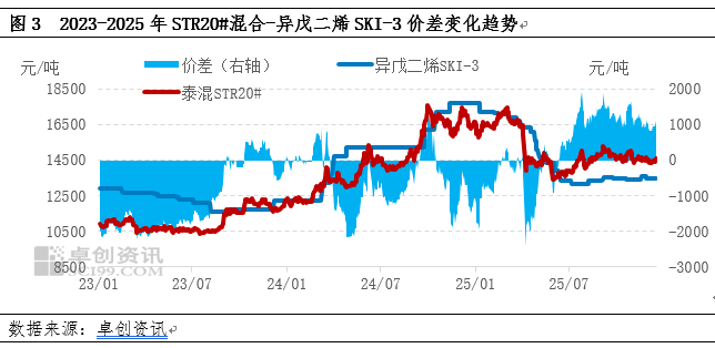 异戊二烯化学结构与天然橡胶基本一致,其弹性、加工性能最接近天然橡胶;但在强度方面略逊色于天然橡胶。2025年下半年起,天然橡胶与异戊二烯橡胶运行趋势劈叉,导致天然橡胶贴水局面被扭转,天然橡胶STR20#混合价格升水异戊二烯橡胶SKI-3价格在单吨千元之上,引发下游发生替代行为。