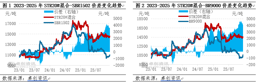 2023年四季度开始,伴随天然橡胶价格重心抬升,天然橡胶前期贴水丁苯顺丁橡胶局面被扭转;至2024年9月份,天然橡胶与丁苯顺丁橡胶价差保持在千元之内,且升贴水趋势不持续,并未出现明显替代情况。但自2024年10月份起,天然橡胶持续升水丁苯顺丁橡胶且价差扩大至千元以上,引发下游在配方上的替代。2025年天然橡胶延续2024年四季度以来宽幅升水合成橡胶的趋势,两者主流价差维持在1500-3500元/吨区间内,导致下游陆续完成在配方上的替换。