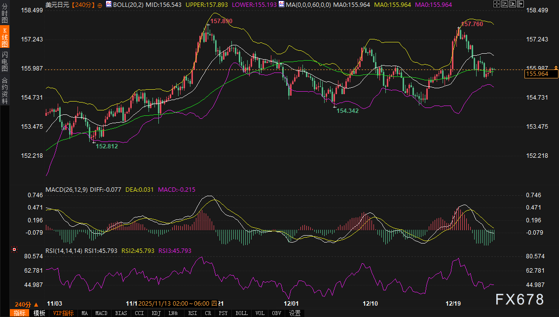 从美元兑日元240分钟图(即4小时图)观察,价格与布林通道:当前汇价在156.50附近,几乎持平于布林带(20,2)中轨156.543。这表明市场在短期内处于相对均衡的状态。上轨157.893与下轨155.193构成了近期的波动范围边界。