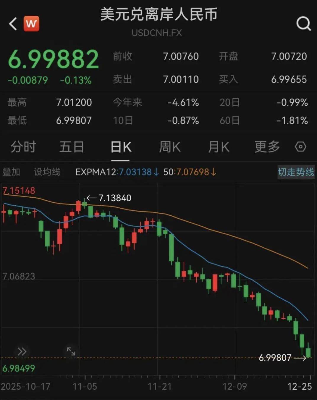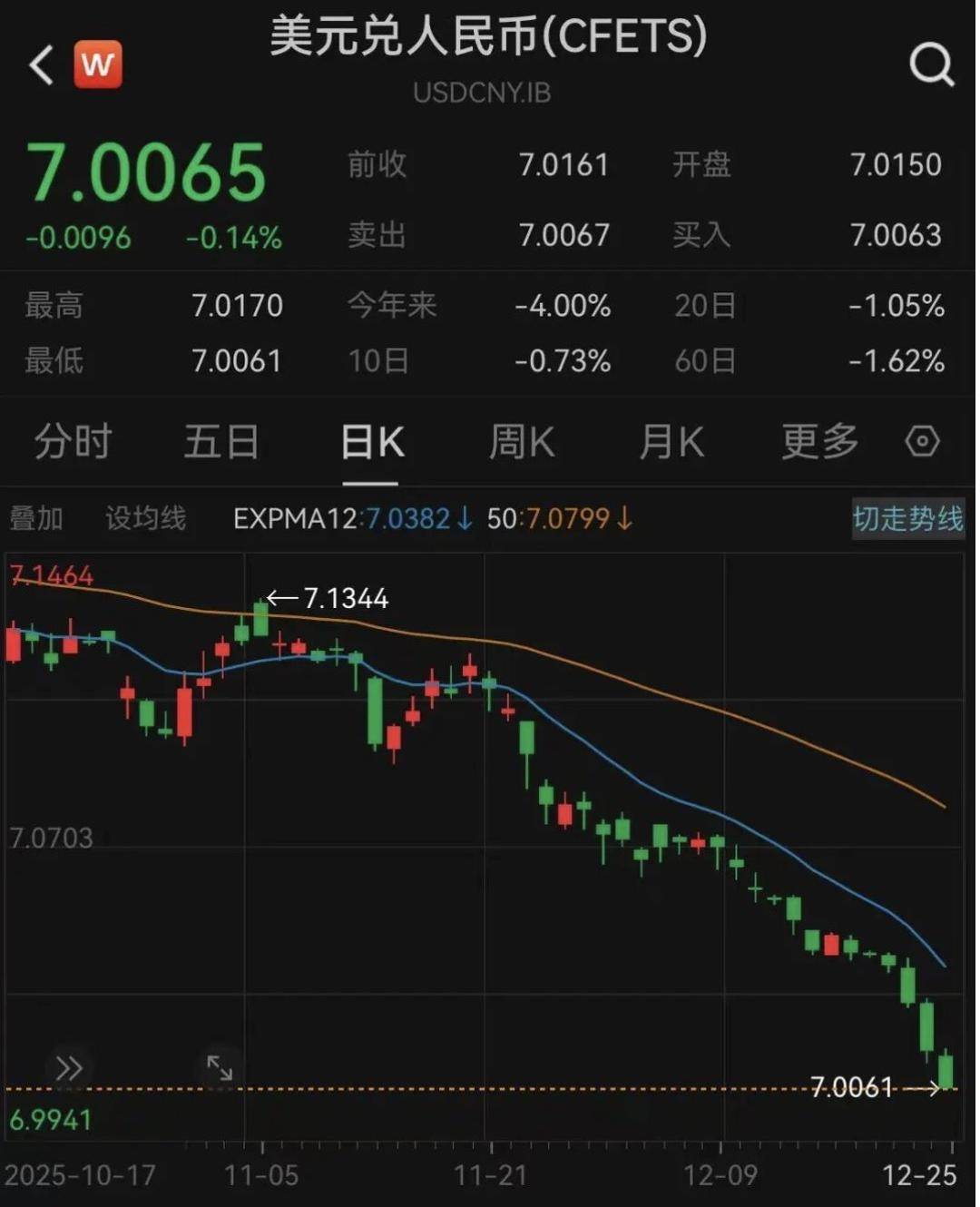 12月25日,离岸市场人民币汇率持续走强,升破7.0大关,为2024年9月以来首次;在岸人民币最高升至7.0061,美元指数跌破98。多家机构认为,2026年人民币有望继续升值。人民币“更值钱了”,对普通人来说,出国旅游、留学、海淘更省钱了。