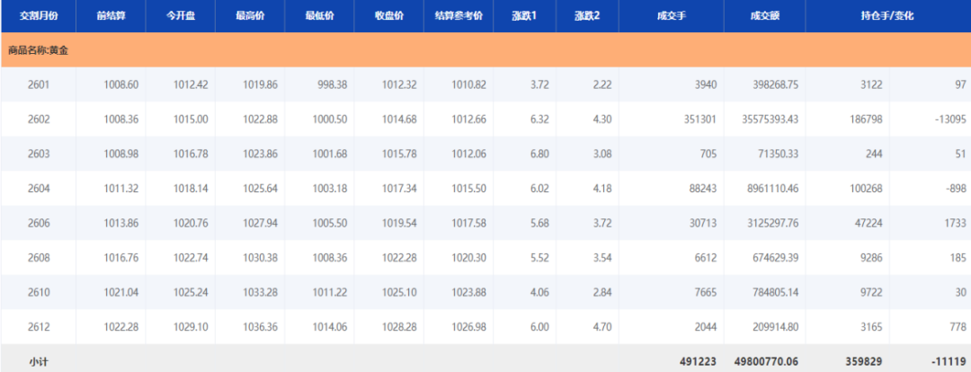 来源:上期所,价格:元/克,交易单位:1千克/手,成交量、持仓量及变化单位为手单边计算;成交额单位为万元,单边计算