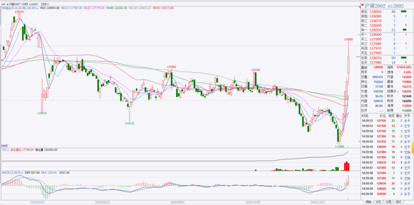 当日(20251224)国内有色金属市场集体走强,沪镍期货领涨板块,迎来强势反弹。沪镍主力2602合约收盘报128,000元/吨,日内最高价130,880元/ 吨,日线收大阳线,日内涨幅4.68%,成交1095301手。