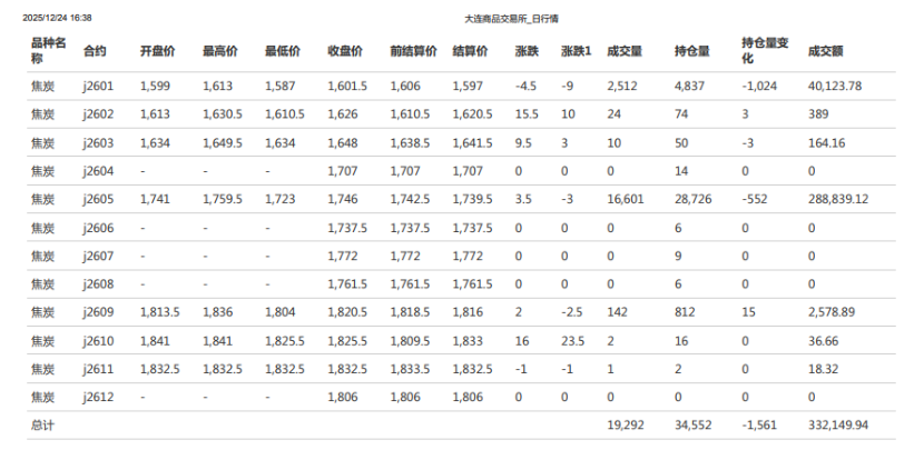 焦炭期货12个合约,价格呈现近弱远强的正向市场格局。全天各合约涨跌不一,涨跌幅度在-4.5点到16点之间。品种持仓量34552手,较上一交易日减少1561手,其中焦炭j2601合约持仓量减少最多,减少1024手。