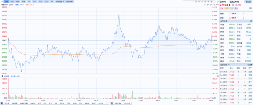 当日(20251224),期货品种焦炭j2605合约呈现震荡走势,最低跌至1723点,最高上涨至1759.5点,合约价格较上一交易日上涨0.20%,收于1746点。成交量16601手,较上一交易日增 28 手;持仓量 28726 手,较前一交易日减 552 手。