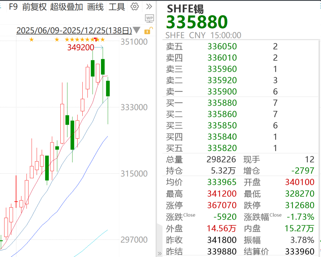 截至12月24日,沪锡主力合约跌超3%,现报33.58万元/吨。