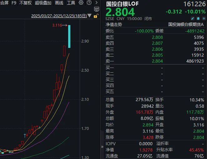 12月25日开市至10时30分,国投白银LOF临时停牌,复牌后快速跌停,最新场内价格为2.804元,相比场外1.9278元的净值,溢价率高达45.45%。前三个交易日,国投白银LOF连续涨停。