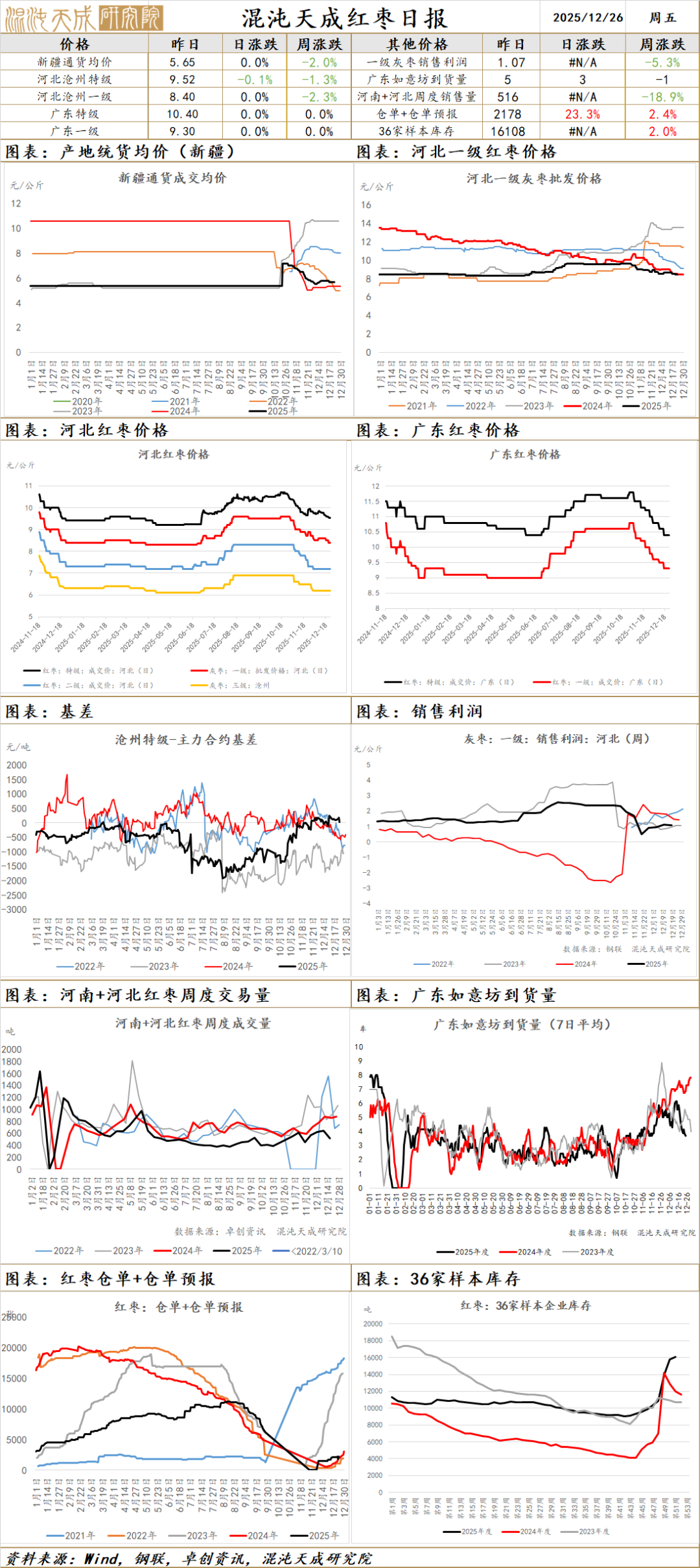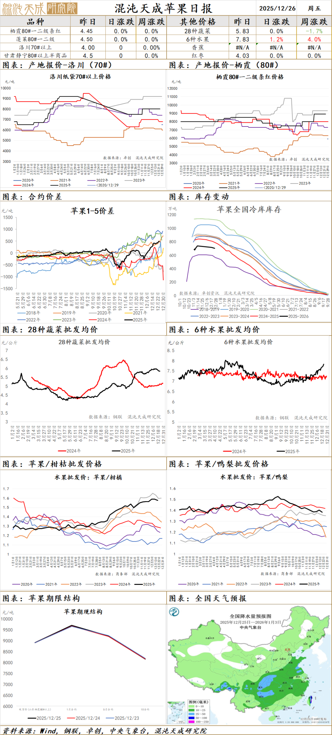 苹果:钢联数据:截至2025年12月24日,全国主产区苹果冷库库存量为744.04万吨,环比上周减少8.94万吨,去库速度低于去年同期的14.49万吨;卓创数据:本周出库10.6万吨,同比低于去年的17万吨;山东产区库存苹果晚熟纸袋富士主流价格稳定,冷库主要成交中小果及少量统货,大果规格成交比较少,果农出货意愿尚可,客户采购不多,其他品种货源电商需求较旺;陕西产区主流价格稳定,贸易商多自己包装自有货源发市场,近期产地冷库出库以高次、三捡过为主;消费端表现偏弱,柑橘等水果大量上市,交割上存在反复,短期博弈仍较强,近强远弱格局延续,近期主要关注消费端表现。