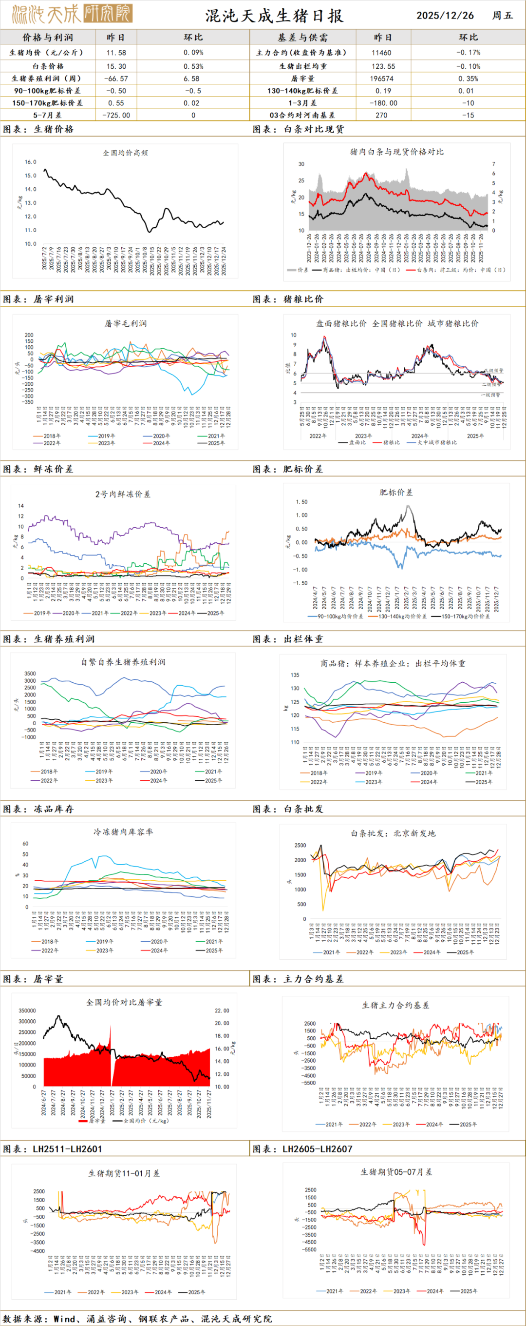 3.机构消息:据上海钢联重点养殖企业样本数据显示,2025年12月25日重点养殖企业全国生猪日度出栏量为288833头,较昨日缩量0.85%。预期明日猪价稳中调整,部分区域或偏弱,短期需关注头部企业出栏情况及二育入场情况。(钢联农产品)