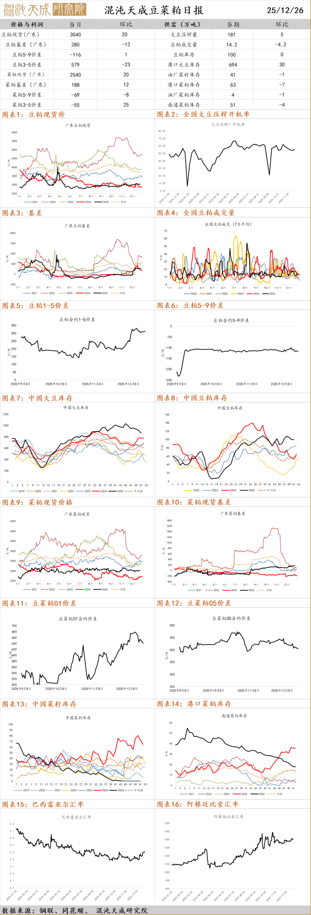 供给端:CONAB数据,截至12月20日,巴西大豆播种率为97.6%,上周为94.1%,去年同期为97.8%,五年均值为94.9%;巴西农业咨询机构AgRural表示,巴西2025/26年度大豆产量预计将达到1.804亿吨,较其11月预估的1.785亿吨有所上调;截至12月13日,巴西大豆播种率为94.1%,上周为90.3%,去年同期为96.8%,五年均值为90.6%;12月USDA大豆供需报告调整幅度不大,维持阿根廷2025/2026年度大豆产量预期在4850万吨不变,市场预期为4857万吨;维持巴西2025/2026年度大豆产量预期在1.75亿吨不变,市场预期为1.7535亿吨;阿根廷宣布将大豆出口税从26%降至24%,旨在提升其农产品国际竞争力;中国表示将恢复三家美国公司对华出口大豆的资格,中国已同意在未来三年内每年至少购买2500万吨大豆,本季购买1200万吨大豆;国家粮油信心中心预估12月我国进口大豆到港量或小幅下降,但油厂开机率保持高位,预计12月全月国内主要油厂大豆压榨量在880万吨左右,同比增加约60万吨,较过去三年同期均值增加约50万吨。
