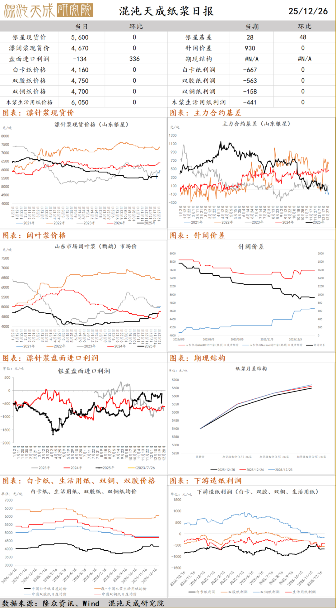 纸浆:APRIL宣布,针对1月份的销售,BHK纸浆价格将上调每吨20美元;昨日国内针叶浆现货稳定,银星5600元/吨(0),俄针5400元/吨(0);阔叶浆现货稳定,金鱼4670元/吨(0);针阔叶浆价差930元/吨(0),纸浆市场整体呈现交投清淡、价格持稳;白卡纸市场行情平稳运行为主,市场交投变化不大,业者操盘心态一般,观望为主;生活用纸市场价格区间整理为主,市场交投积极性一般;文化用纸市场偏稳为主,整体交投不旺;本周国内纸浆主流港口样本库存量为190.6万吨,较上期去库8.7万吨,环比下降4.4%;本周下游开工,白卡纸环比+1.7%,双胶纸环比-0.3%,铜版纸环比+0.4%,生活用纸环比+1.4%;盘面高位震荡,近年针叶浆整体产能扩张有限,持续低价导致上游高成本浆厂出现停产、关闭产能等情况,下成本支撑明显,同时交割品取消部分俄针品牌,对远月估值也有利多,国内纸厂整体维持刚需购买,在国内春节旺季结束前,可以考虑回调逢低买入。