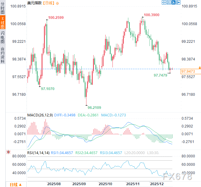 短期看,美联储的“防守”举措利好美元稳定;但中长期看,领导权过渡的迷雾和政治干预的阴云,为美元的长期价值埋下了隐患。周五(12月26日)亚市时段,美元指数于近两周低点(97.75)上方不远位置窄幅震荡。