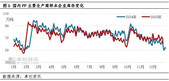 从库存来看,上半年PP生产商库存波动呈现出明显的周期性特征,其变化主要受节假日、关税政策和市场信心等多重因素的交互影响。具体来看,一季度库存呈现稳步去化趋势,生产企业库存水平维持在可控区间,对PP价格驱动中性。二季度去库节奏持续转换,四月份受关税政策调整预期的影响,市场观望情绪浓厚,去库节奏受到一定扰动。进入五月份,五一小长假导致库存小幅累积,但中美经贸高层会谈取得实质性进展,修复了市场偏空预期,下游工厂补货积极性提升,贸易商由被动去库转为主动去库,有力支撑了库存去化。六月份去库节奏趋于平缓,但整体库存压力维持中性水平,对价格方向性走势缺乏明显驱动。下半年承接二三季度新产能释放压力以及淡季需求拖累,下半年PP生产企业库存压力整体偏高。进入12月华北PP供应端承接全年的新装置投产产量,虽有部分装置停车检修,但月产量仍位居历史高位。需求端,下游工厂原料采购积极性普遍偏低,货源向下流转压力加大。中上游企业控库为主,挺价意愿不强,部分生产企业持续下调企业价格以刺激中间商及下游工厂拿货,对PP价格也形成拖累。