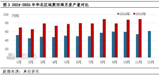 受区域产能持续投放影响,2025年华北区域PP月度产量均高于去年同期。年内华北区域新增内蒙古宝丰二线、三线,裕龙石化二线、四线以及山东新时代高分子材料(金诚石化)五套装置产线,淘汰万华化学30万吨产能,共计新增产能165万吨,在中国PP总产能占比达25.34%,较去年增长1.22个百分点,成为国内PP产能占比最大的区域。在新增产能平稳释放下,华北区域PP产量增长明显,据卓创资讯估算,华北区域2025年1-11月PP累计产量在868.44万吨,同比增长51.61%,区域供应压力加剧明显。12月华北区域新增中英石化一条线、金能化学二期一线等装置短修,月产量或小幅下滑但仍居同期高位,供应压力难有有效缓解,对PP市场价格支撑仍较弱。