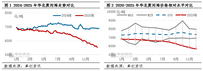 综合来看,华北聚丙烯2025年全年受供强需弱格局拖累,PP市场价格持续下行。12月华北市场供给端仍保持充足状态,但需求端走弱进一步加剧了市场的弱势氛围,再加上宏观层面缺乏针对性的利好政策加持,多重利空因素交织共振,PP价格持续在弱势区间寻底运行,在12月下旬跌破“6000”底线。