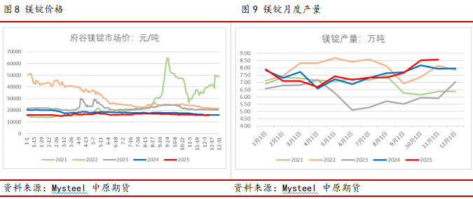 金属镁是硅铁下游中仅次于钢铁行业的第二大需求。2025年金属镁价格呈现“震荡博弈、区间波动”特征,供需两端的结构性变化主导市场走势。价格方面,全年围绕15000-17500元/吨区间波动,其中年初受供需宽松拖累价格跌至年内最低点,进入三季度受需求和成本回升推动镁价涨至17450附近,为年内高点。四季度镁市场价格震荡下行,厂家开工却持续处于高位,厂家累库速度高于前期,整体呈现“成本托底、需求约束”的震荡格局。钢联数据,1-11月金属镁产量82.8万吨,同比+0.6%。一季度西北主产区镁厂因亏损和环保督查减停产较多。二季度虽有所回升,但主产区多以进入避暑检修状态,整体产量和对硅铁消费量较为有限。进入下半年尤其四季度,前期检修停产企业陆续恢复生产,10-11月产量再次攀升至年内高位。