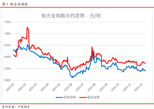 2025年铁合金期货呈“上半年单边下跌、下半年震荡企稳”的阶段性走势。上半年,锰硅受海外锰矿扰动短暂反弹后,因需求疲软持续走跌;硅铁供需双弱叠加成本坍塌,跌势更为顺畅。下半年,行业高库存与下游需求转弱形成压制,虽企业减产、部分产区电价上调提供成本支撑,且“反内卷”等政策短期提振情绪,但价格反弹有限,整体维持底部震荡。全年产能过剩主导走势,成本与政策仅短期扰动,年末在供需博弈中弱势收尾,未现趋势性反转。截至12月24日收盘,硅铁主力合约收于5656元/吨,年内跌幅9.6%,锰硅主力合约收于5832元/吨,年内跌幅4.2%。