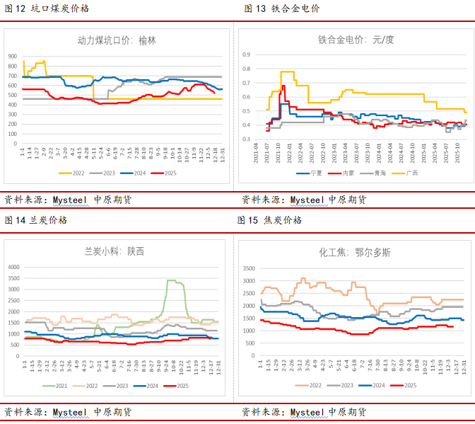 煤电成本占硅铁生产成本的60%以上,今年硅铁成本呈现“上半年电价主导下行,下半年原料支撑反弹”的震荡格局,成本重心较2024年明显下移,直接拖累硅铁期现价格震荡走弱。具体来看,一季度主产区电价维持相对稳定,但4月宁夏电力现货市场结算落地,叠加新能源发电充足、企业避峰生产增加谷电使用,西北地区硅铁厂结算电价环比降幅达0.02-0.06元/度,降至0.34-0.41元/度区间,青海部分厂家电价亦下探至0.35-0.37元/度 。按单吨硅铁电耗7800-8000度测算,此次电价下调直接带动成本下移156-480元/吨,成为二季度硅铁价格加速下跌的主要原因。进入下半年,成本端支撑力度逐步显现:9月起,内蒙古、陕西主产区煤矿检修导致兰炭供应收紧,价格从1800元/吨攀升至2000元/吨。同时冬季用电高峰临近,宁夏地区工业电价回升至0.405元/度,单吨电费成本较年中增加超120元,进一步抬升成本中枢,硅铁企业亏损范围不断扩大。全年来看,硅铁成本在5300-5800元/吨区间波动,成本端缺乏持续上行动力,叠加下游钢厂利润承压持续压缩原料采购价。尽管下半年兰炭与电价共振推升成本,但高库存与弱需求制约价格传导,硅铁期现价格呈现震荡下行态势。