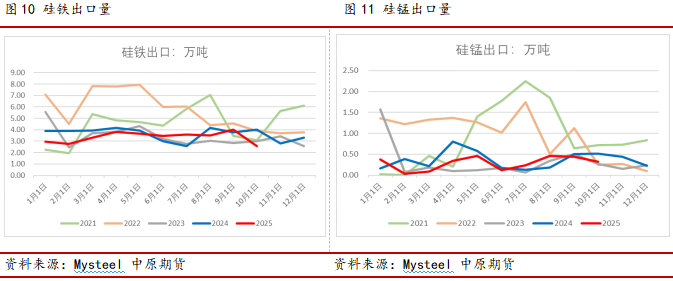 出口方面,更多对应海外制造业和粗钢产量。根据世界钢协数据,今年1-10月海外粗钢产量6.97亿吨,同比增0.15%,除日韩产量回落之外,其他国家粗钢产量均有不同程度增长。但今年铁合金出口同比下滑明显,1-11月硅铁出口36.8万吨,同比-8.4%,其中出口至日本同比增3.7%至10.6万吨,韩国增10.9%至9.7万吨,降幅主要是印尼出口大幅回落拖累。1-11月硅锰出口3.4万吨,同比降15%,印尼占比超80%,是硅锰进口的主要国家。总的来看,2025年硅铁和锰硅出口同比下滑,主要受全球需求走弱、俄罗斯和朝鲜低价资源转口冲击和欧盟反倾销贸易壁垒增加等因素叠加。展望2026年,在没有强政策刺激之下铁合金出口形势较难改观,建议合金外贸企业加速碳足迹认证和绿电消纳比例,或布局海外产能规避贸易壁垒。