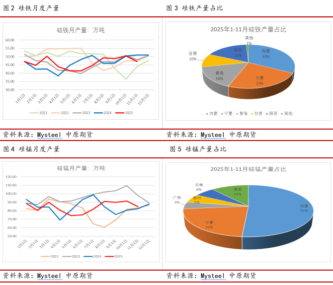 锰硅:1-11月全国锰硅产量合计928万吨,同比+0.14%。锰硅行业供应韧性较强,产区格局呈现明显分化:北方主产区持续发力,内蒙古以476万吨产量稳居第一,同比增长2%,宁夏产量205万吨,同比大幅提升9.5%,两地合计占全国产量超70%,成本优势支撑其开工率高位运行。南方产区则表现疲软,贵州产量49.4万吨,同比骤降24.7%,广西产量40万吨,同比小幅下滑1.5%。全年产量受成本波动、工艺调整及下游钢铁需求偏弱影响,呈现区域结构性调整特征,北方产能集中化趋势进一步凸显。