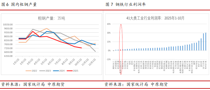 2025年硅铁供增需降,产业延续宽松格局,消费端金属镁和不锈钢等非钢领域表现较好,但难抵粗钢和出口下滑的较大缺口。锰硅2025年供需形势与硅铁类似,今年供应同比持稳,但需求降幅近5%,粗钢和出口消费均出现大幅回落。接下来我们重点从粗钢、出口和金属镁三大行业展开。