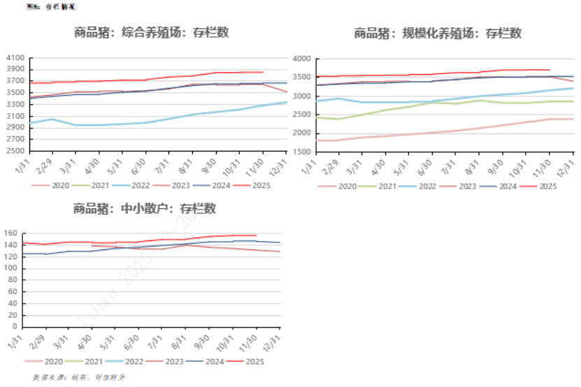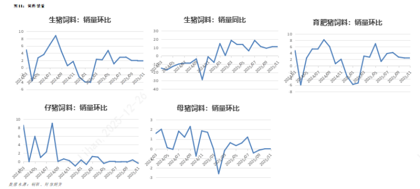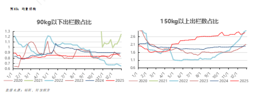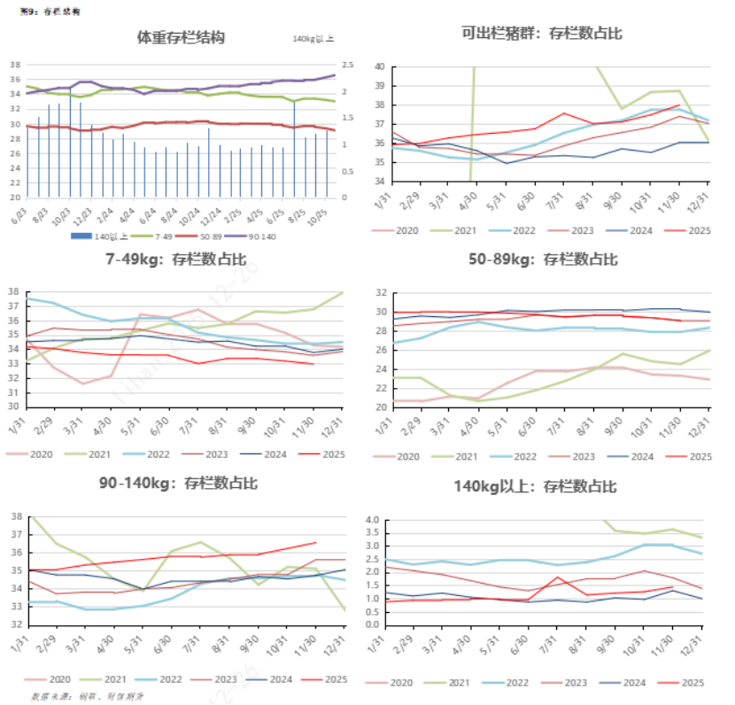 8、出栏体重:据钢联数据显示,2025年出栏均重与2024年变化不大,整体持平,下半年在大猪需求传统旺季的背景下,增幅亦不明显,一方面是政策引导减重出栏,另一方面是部分企业养殖利润仍就亏损,增重意愿不强。2026年出栏体重或整体平稳,与25年出栏均重变化不大,26年下半年或可能出现一定幅度的增量,主要原因是预期利润修复的背景下,养殖端会增重出栏,提高销售利润。