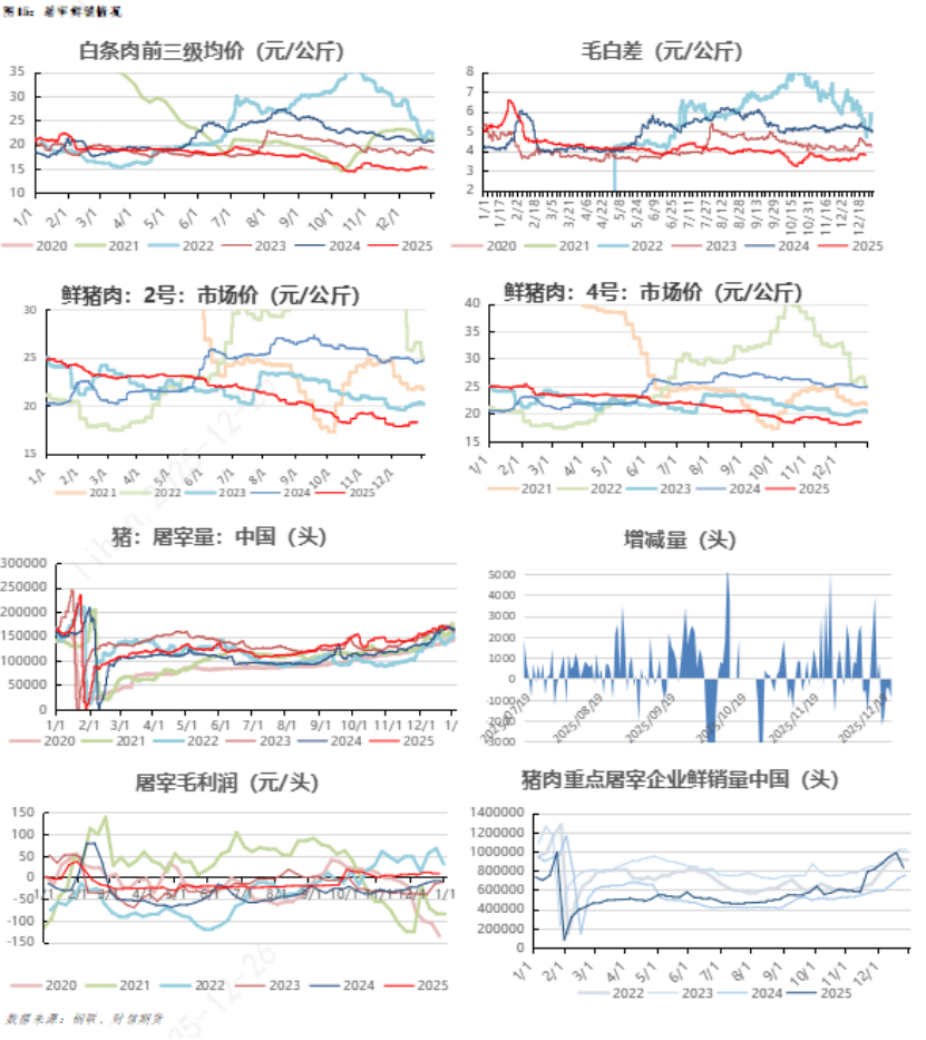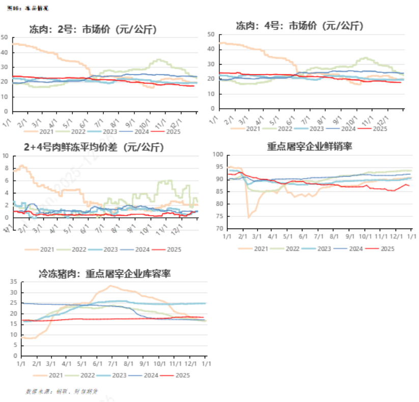 3、冻品情况:随着猪价中枢不断下行,冻品市场亦跟随猪价下跌,但跌幅整体有限,鲜冻品价差整体平稳运行。从冻品库存角度来看,2025年度屠企未出现集中性大规模建库现象,更多的是受制于终端需求不好,屠企存被动建库的情况,特别是在2025年下半年,供应增量明显,需求虽有提振,但供应增量远大与需求增量,屠企被动入库,该点也侧面表明供应宽松是下半年猪价运行的主要逻辑。从当下的库存水平来看,目前冻品的库存压力不大,对猪价的抑制作用偏小,当2026年猪价上行时,或起到一定的助推作用。