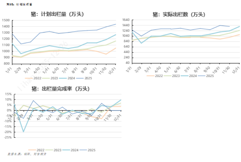 6、计划出栏率:根据钢联数据显示,2025年生猪养殖集团出栏计划增量较2024年相对明显,实际出栏量同比增加幅度约10-25%,增量明显。从年内各出栏月份上来看,秋冬旺季出栏增加的季节性规律依然存在,但7-9月份出栏完成偏低,一方面与夏季需求转淡有关,另一方方面亦与养殖端主动压栏有关。