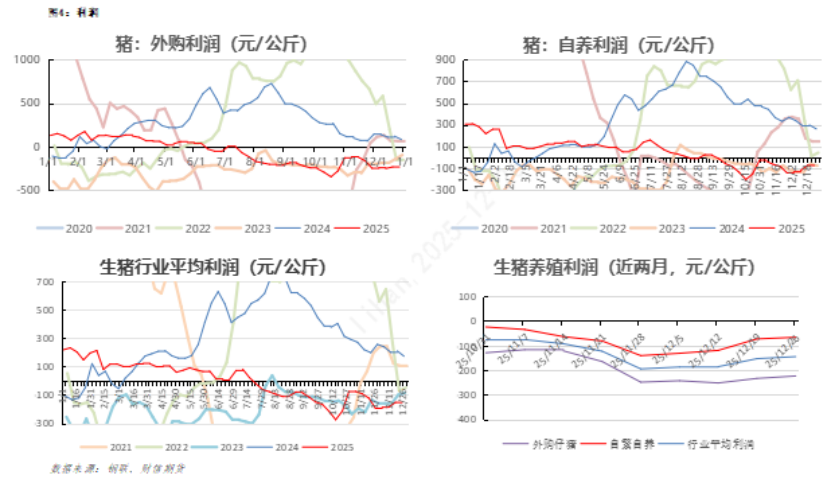 26年随着国家政策引导和行业亏损,母猪产能逐步去化,对应到26年出栏的商品猪数量逐步下移,利润水平较2025年或迎来修复。但需分阶段来看,明年上半年供应仍较为充足,养殖利润水平或整体有限或仍将处于微亏阶段,但下半年随着去化明显加快,生猪养殖或迎来一定程度的修复。根据养殖模式的区分,因仔猪销售亏损,明年部分时间段外采仔猪的利润水平或高于自繁自养模式下的养殖利润。