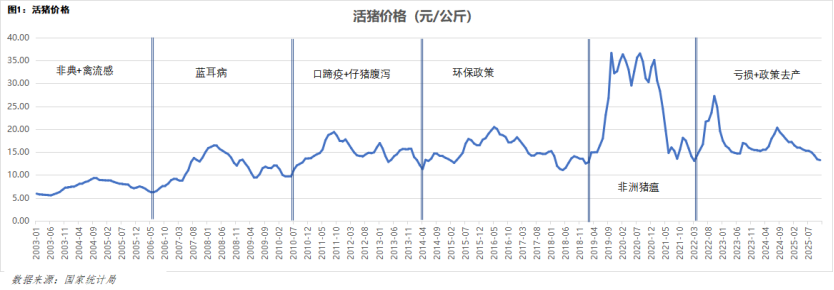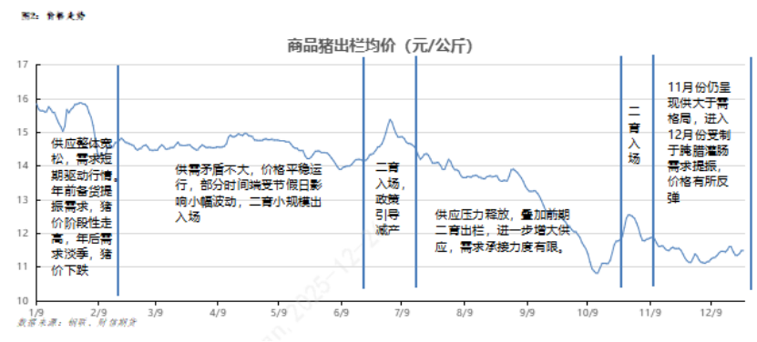 2025年现货市场回顾:2025年全年生猪价格整体呈走弱态势,价格中枢不断下探。2025年上半年供需矛盾不大,猪价整体震荡运行,下半年供应压力释放,猪价快速大幅度下探,我们认为2025年猪价运行的核心逻辑在于供应的变化。可以看到25年度猪价短期的快速上涨的逻辑几乎均来自于二育的入场,猪价持续下跌的主要逻辑均来自于供应压力宽松。