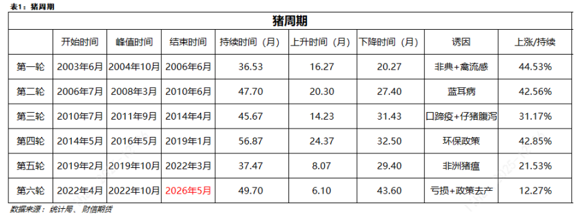 自2003年开始计算,截止至目前我国一共经历了六轮猪周期,各轮猪周期成因各不相同,但本质上均是产能变化的滞后效应所导致的。我们认为2022年至今仍处于第六轮周期之中,从时间维度上来看,目前处于第六轮周期的尾部阶段(红色字体代表预期结束时间),我们认为,明年下半年或将开启新一轮周期。