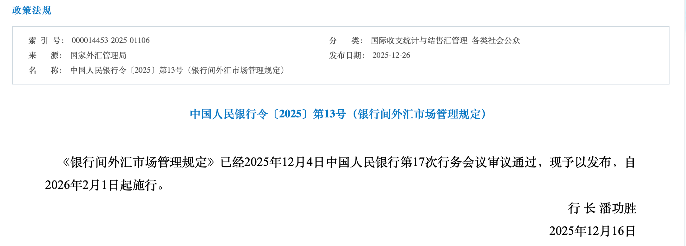 12月26日,中国人民银行发布了《银行间外汇市场管理规定》(中国人民银行令〔2025〕第13号),旨在规范和发展外汇市场,扩大高水平对外开放,防范相关风险并更好服务实体经济,该规定将自2026年2月1日起正式实施。