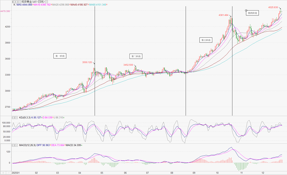 2025年,黄金市场表现强劲,屡创历史新高。现货黄金整体在2614-4526美元/盎司区间内强势运行,涨幅在71%左右;沪金整体在614-1018元/克区间强势运行,涨幅在64%左右。