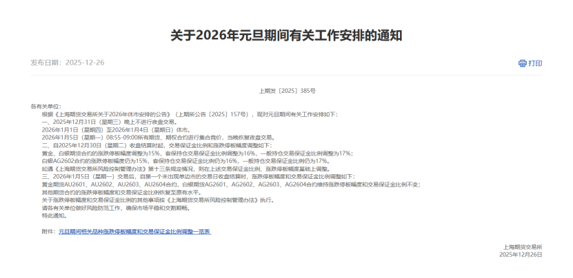 在另一条通知中,上期所还对黄金白银期货相关合约交易保证金比例和涨跌停板幅度做出调整:自2025年12月30日(星期二)收盘结算时起,黄金、白银期货合约的涨跌停板幅度调整为15%,套保持仓交易保证金比例调整为16%,一般持仓交易保证金比例调整为17%;白银AG2602合约的涨跌停板幅度仍为15%,套保持仓交易保证金比例仍为16%,一般持仓交易保证金比例仍为17%。
