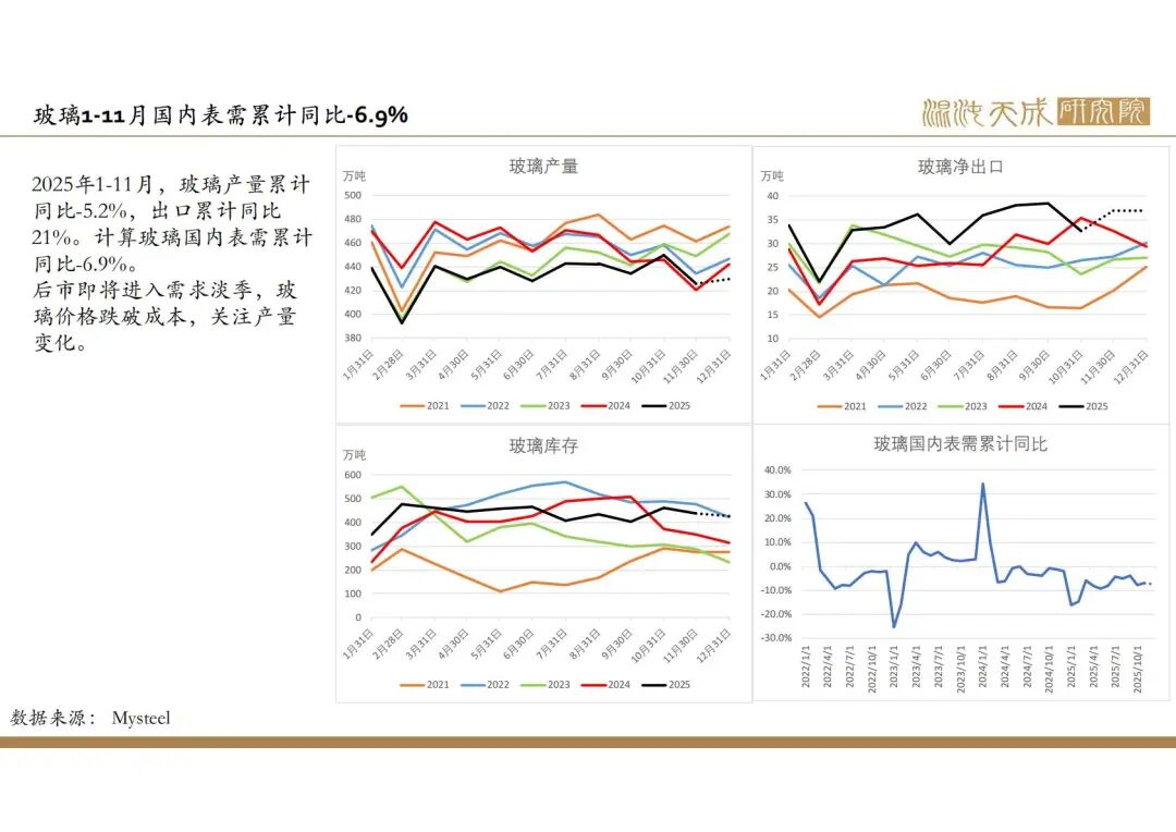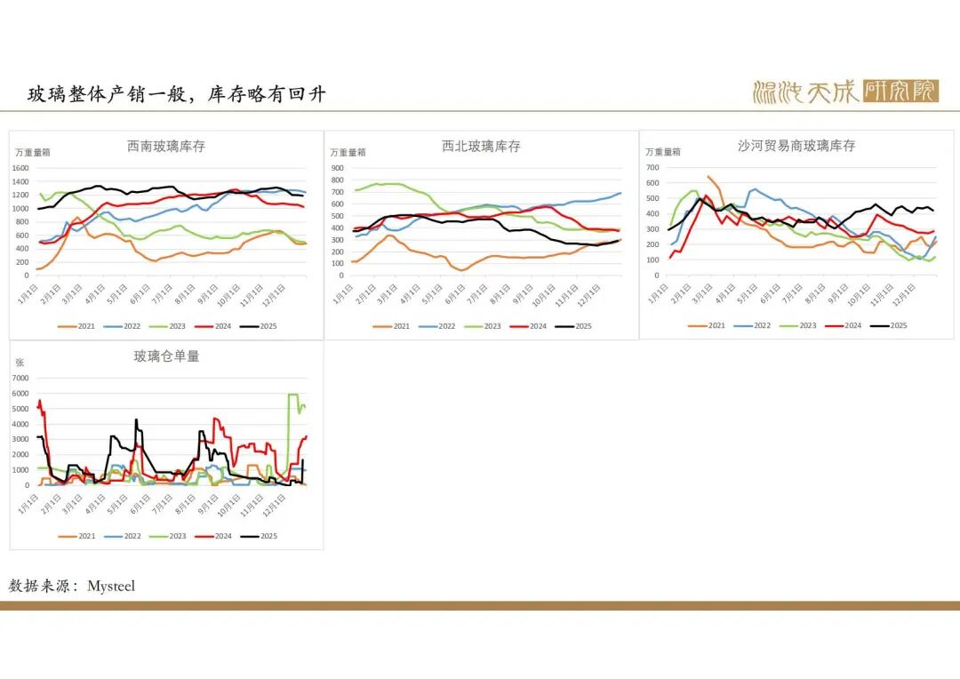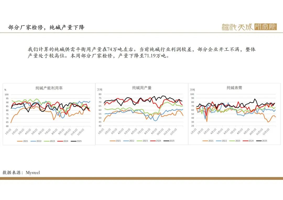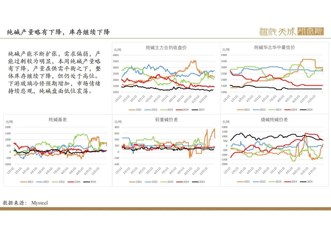 浮法玻璃弱势下跌至成本附近,产量维持较低位。光伏玻璃减产之后,库存下降至低位,日熔量有所回升,但累计产量仍下降10%左右。烧碱价格高于纯碱,纯碱对烧碱需求有一定替代,但整体需求仍一般,没有实质性变化,当前计算纯碱周度供需平衡产量在74万吨左右。