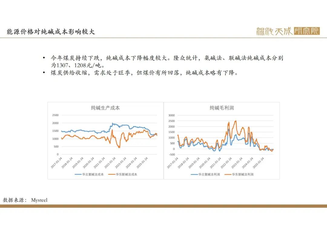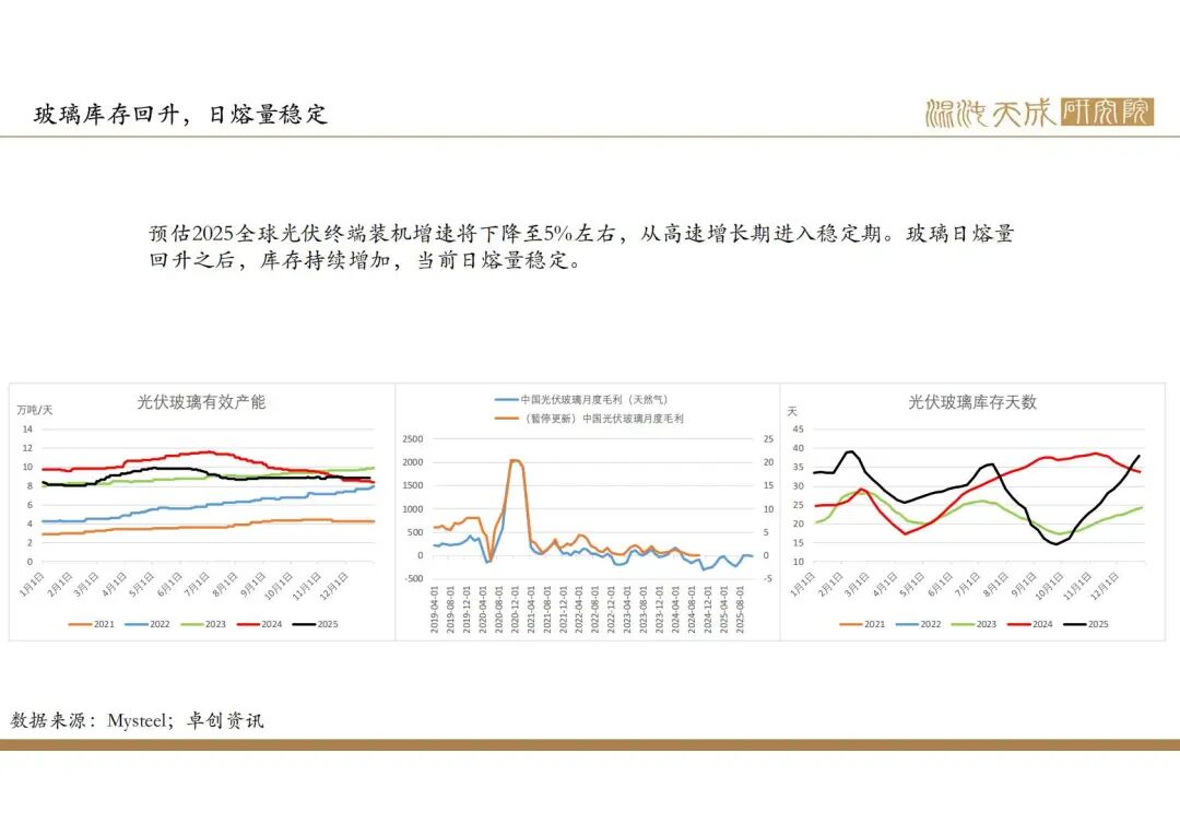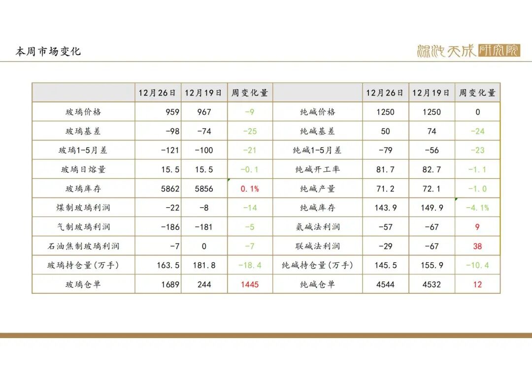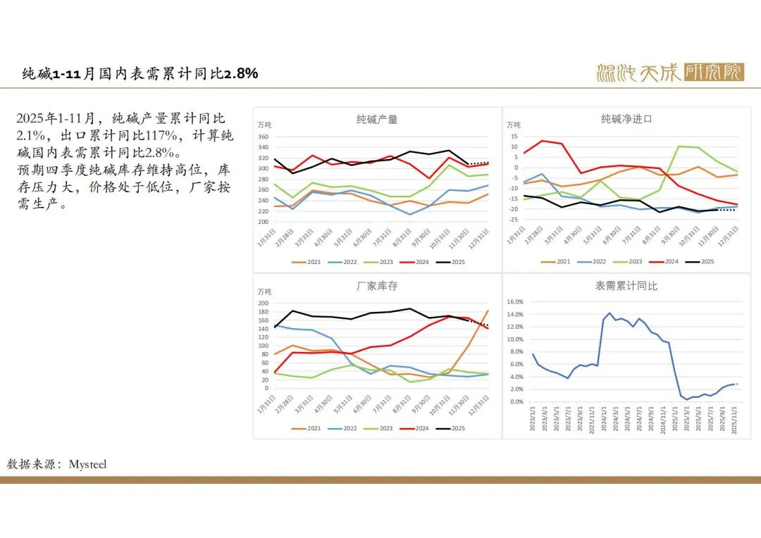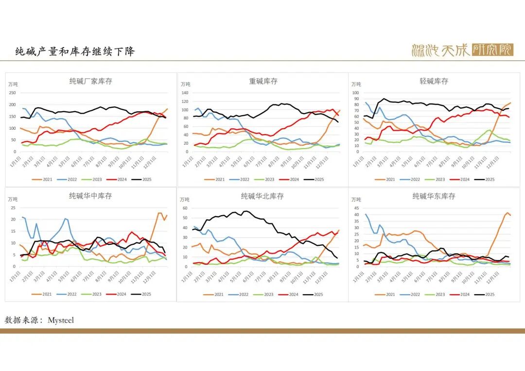 浮法玻璃弱势下跌至成本附近,产量维持较低位。光伏玻璃减产之后,库存下降至低位,日熔量有所回升,但累计产量仍下降10%左右。烧碱价格高于纯碱,纯碱对烧碱需求有一定替代,但整体需求仍一般,没有实质性变化,当前计算纯碱周度供需平衡产量在74万吨左右。