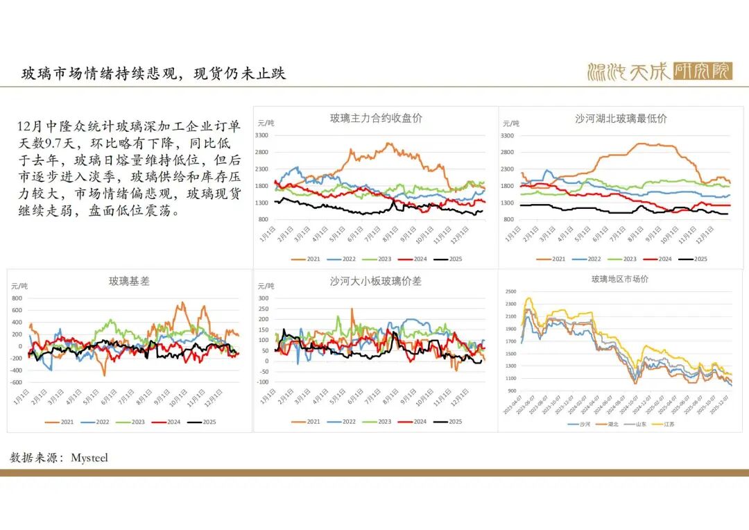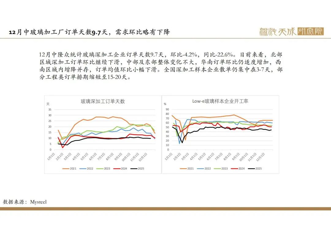 12月中隆众统计玻璃深加工企业订单天数9.7天,环比-4.2%,同比-22.6%。目前来看,北部区域深加工订单环比继续下滑,中部及东部整体变化不大,华南订单环比仍适度增加,西南区域内增降并存,订单均值环比小幅下滑。全国深加工样本企业散单仍集中在3-7天,部分工程类订单排期缩短至15-20天。