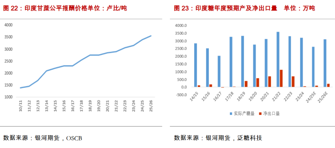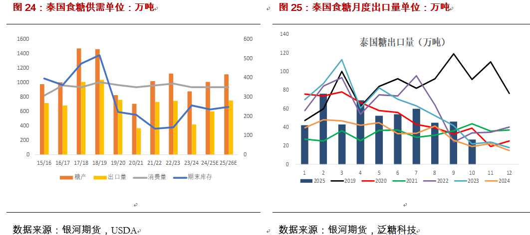 泰国25/26榨季,天气较为适宜,降雨理想,预计本榨季泰国糖产量也将维持在高位。市场预计25/26榨季泰国糖产将达1100万吨,出口量预计也将增加100万吨左右,届时泰国为全球供应的糖及糖浆预拌粉等量预计将达到600-700万吨。