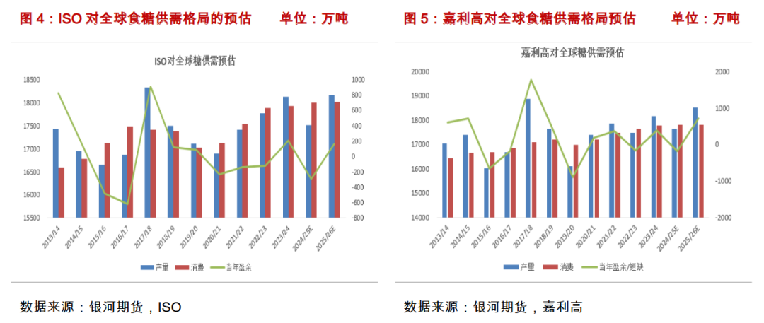 嘉利高最新报告将全球糖供应量放到18540万吨,同比增加900万吨,全球糖消费放到17820万吨,同比基本持平,年度结余720万吨。结余量较之前预期有所增加。预计2024/25榨季全球糖市供需缺口为180万吨。