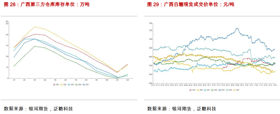 第四阶段(2025年10-12月)国内外糖价走势关联性下降明显,国外先跌后震荡,国内先震荡后跌。随着巴西糖产逐渐清晰之前的增产基本兑现,糖价继续下跌,但是随着巴西榨季结束巴西糖的供应压力缓解,因此国际糖价下跌后震荡。而国内郑糖一方面由于今年国内糖产量大增且逐渐进入压榨高峰供应销售压力增加,另一方面进口糖也超预期增加对糖价形成较大压力,郑糖先震荡后跌。