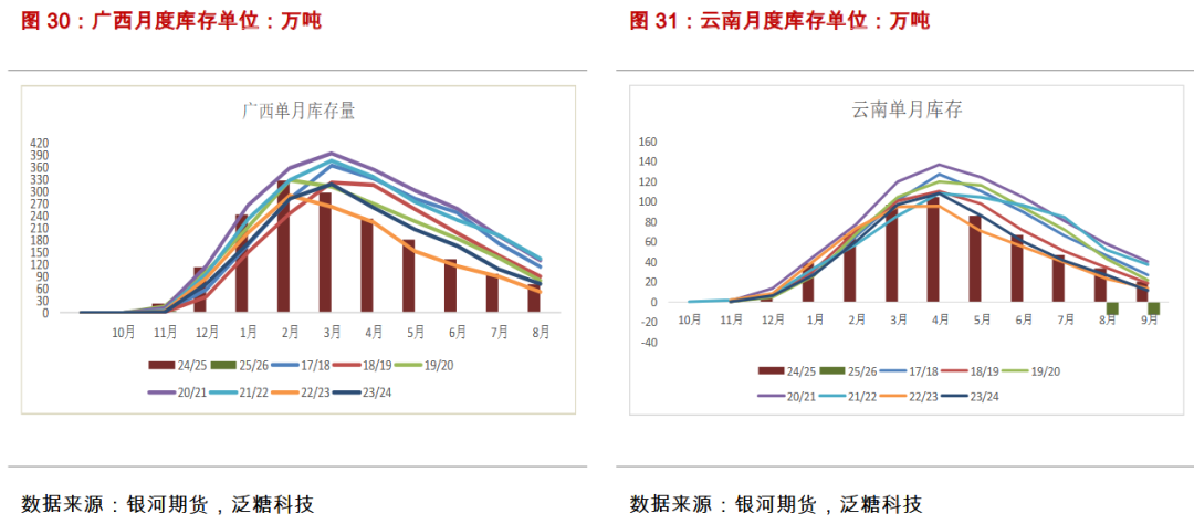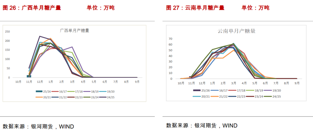 根据各地糖协数据,2025/26榨季,广西糖产在670万吨,同比增加23.5万吨;云南糖产在260万吨,同比增加18.12万吨;内蒙糖产在70万吨,同比增加3.65万吨;广东糖产在60万吨,同比减少5.45万吨;新疆糖产在76万吨,同比减少5.42万吨;全国合计糖产在1156万吨,同比增加39.4万吨。我们根据调研数据预期,广西本榨季糖产在700-710万吨左右,如果其他地区都按照各地糖协数据计算,则全国糖产预计在1186-1196万吨,同比增加70-80万吨。如果云南地区增产预期也超过糖协数据的话,2025/26榨季糖产可能同比增加100万吨上下。