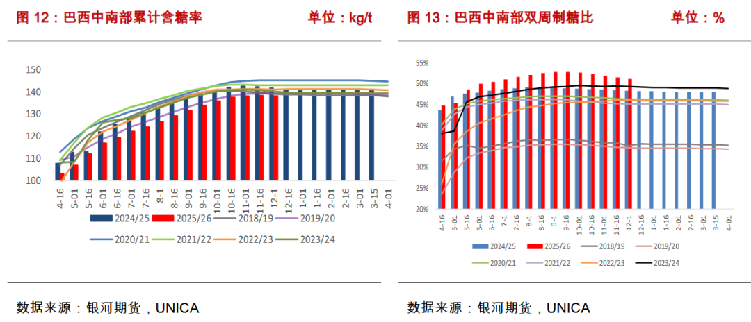 巴西25/26榨季糖产预期较高,根据巴西国家商品供应公司(Conab)最新的数据显示,2025/26巴西糖产预计在4502万吨(中南部产区4134万吨,8月份4064万吨),略高于8月份的4446万吨,2024/25年度产量为4412万吨,2023/24年度产量为4569万吨。当前产量是近些年的次高位。市场预期巴西25/26榨季产量要比24/25榨季增产100万吨左右,但是根据Unica的数据,截至11月底,巴西中南部累计产糖量较去年增加44.6万吨,预计最终增产幅度可能不及之前市场预期。