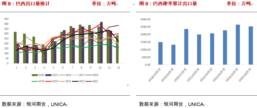 出口方面,25/26榨季10月份是巴西糖的出口量非常高,创下2012年以来的出口新高,但是其他月份的出口量大部分时间都是低于去年同期的,11月份出口量也出现了明显的下跌。从出口糖的月度走势来看,随着巴西糖榨季结束出口糖量也将出现季节性减少。数据显示,巴西11月出口糖和糖蜜330.23万吨,较去年同期的339.02万吨减少8.79万吨,降幅2.59%。巴西2025/26榨季(4月-次年3月)截至11月累计出口糖2524.34万吨,同比减少4.3%。今年巴西糖产量较高因此出口量也较高,25/26榨季巴西糖累计出口量已经是近些年仅次于去年的高位,因此对于全球糖的供应来看压力较大,但是随着巴西榨季结束,未来几个月巴西的出口量将逐渐减少,供应端压力有所缓解。