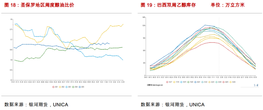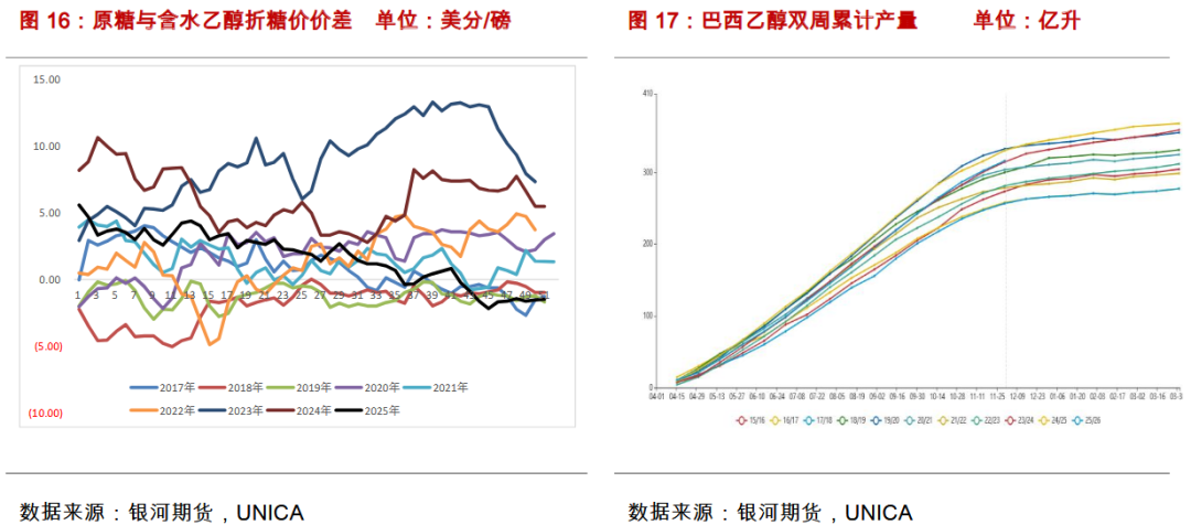 对于2026年巴西糖价的走势,我们认为2026年的巴西糖价格筑底反转的一年。2026/27年巴西糖增产周期的最后一年,而目前糖价已经跌至14美分/磅附近处于巴西成本线附近,而这个糖价已经低于全球大部分的糖生产成本,因此低价难以长时间维持。此外巴西乙醇折糖价较高,目前乙醇折糖价在16-17美分/磅,如果后期乙醇价格不跌,那么糖价大概率要向着乙醇折糖价的价格区间去。因此我们认为2026年国际糖价是筑底反转的一年。