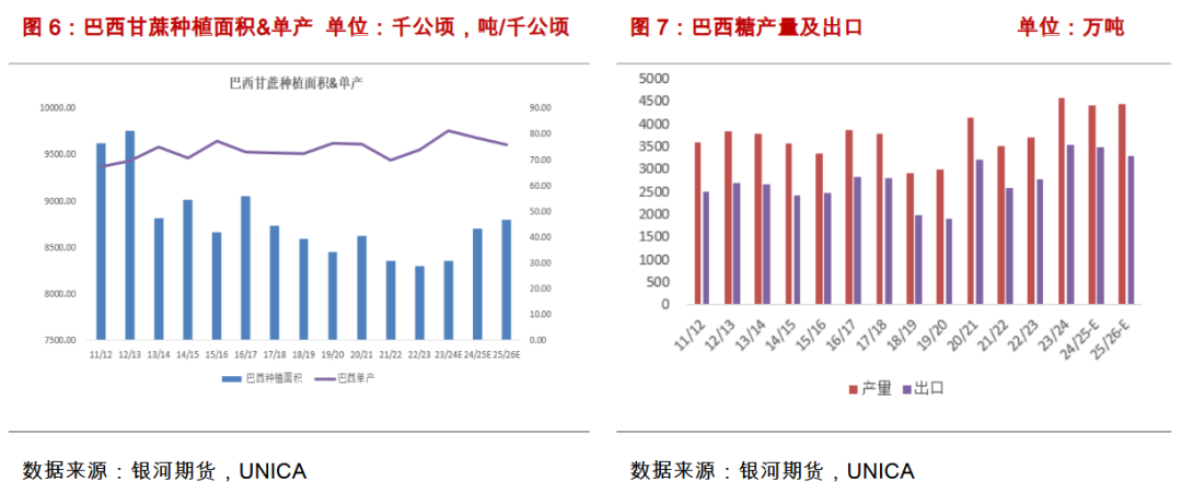 根据CONAB数据,25/26榨季巴西甘蔗种植面积8792.98千公顷,同比增加1.1%,其中中南部产区种植面积为7826.27千公顷,同比增加1.3%。25/26榨季巴西甘蔗单产为75.45吨/公顷,同比减少3.3%,其中巴西中南部甘蔗单产为77.04吨/公顷,同比减少3.5%。
