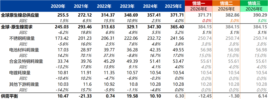情境一:印尼RKAB镍矿审批配额显著减量,且在26年严格进行镍矿资源的管控,但菲律宾、俄罗斯、加拿大等国增加镍矿生产、补充部分镍矿缺口,使原生镍供应维持25年的水平,即供应增速为0%。