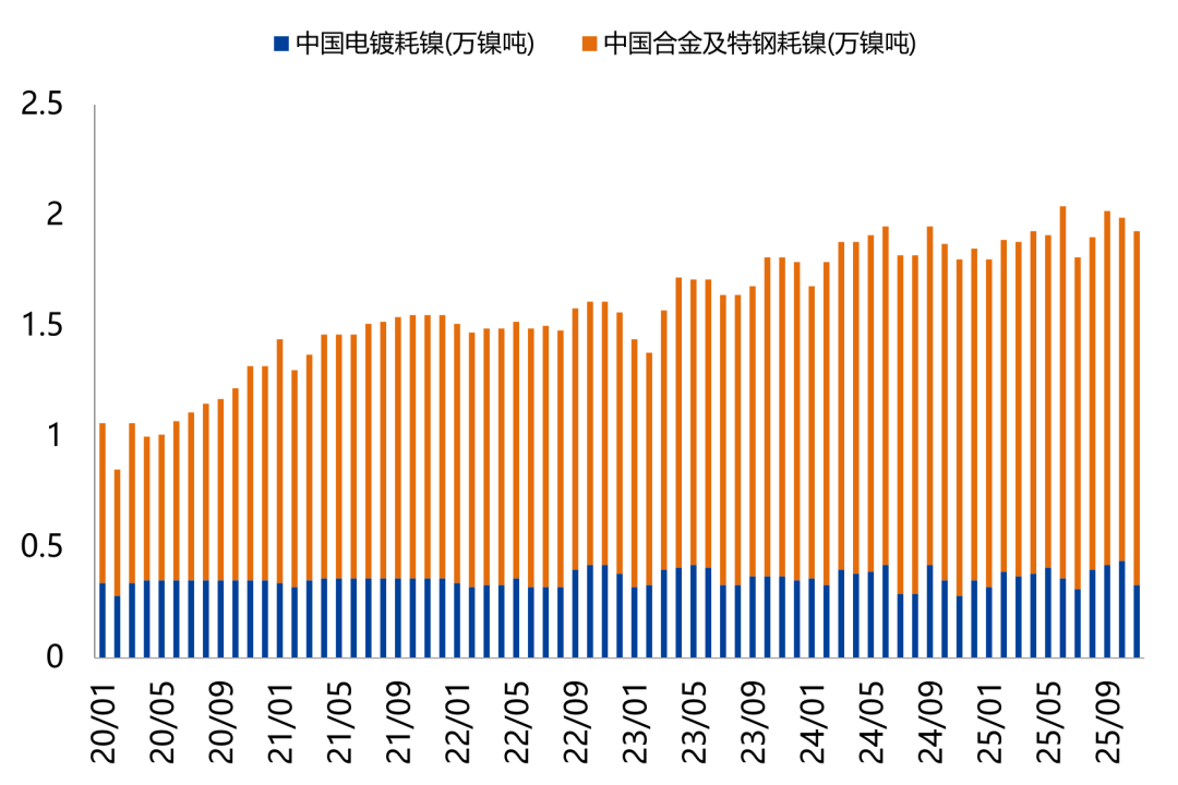 电镀、合金及特钢是精炼镍下游的主要构成部分。电镀对镍需求维持稳定,年耗镍量维持在4.3万镍吨左右;合金及特钢耗镍量自2021年以来稳定增长,近5年复合增速达到14%,但该部分需求占镍元素总量的需求比例较低,整体影响程度较小。相比月产量3.3万吨的精炼镍,电镀合金受限于需求体量,难以消化精炼镍高库存,对整体需求的影响也较为有限。